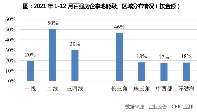 區域層面,長三角依然最受開發商青睞,百強房企全年投資金額中有46%集中于長三角,其次珠三角、中西部和環渤海各占17%-18%,整體形成了“一超三強”的格局。