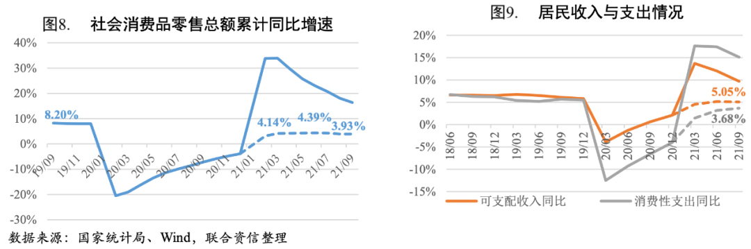 三季度消費復蘇放緩。2021年前三季度,我國社會消費品零售總額31.81萬億元,同比增長16.40%,兩年平均增速3.93%,較上半年兩年平均增速小幅回落,與疫情前水平仍有一定差距,三季度居民人均可支配收入、消費性支出修復同步放緩。中秋節假期以及十一小長假臨近帶動9月單月消費較8月的低點小幅反彈,疫情對消費的負面影響有所緩解。四季度消費仍會受到點狀散發疫情影響,但電商購物節等因素有助于帶動消費提升。