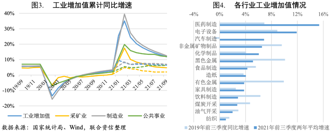 主要行業[3]方面,醫藥制造業、計算機、通信和其他電子設備制造業以及汽車制造業受出口帶動前三季度工業增加值兩年平均增速較高,但受芯片、電池等供應鏈短缺影響,三季度特別是8月汽車制造產能擴張承壓;而黑色、有色金屬冶煉及延壓加工業和非金屬礦物制品業工業增加值較2019年下降較大,主要是限電限產等措施對鋼鐵、有色和水泥等高耗能行業產能負面影響較大,其中黑色金屬冶煉及壓延加工業工業增加值兩年平均增速繼續下滑,除了供給端的限制外,還受到需求端地產降溫的影響。