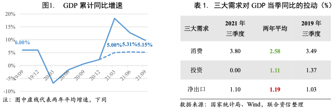 三季度經濟修復放緩。三季度我國國內生產總值29.10萬億元,同比增長4.90%,兩年平均增長4.90%,較二季度兩年平均增長(5.52%)有所放緩;三季度環比增長0.20%也較二季度(1.20%)明顯回落,三季度經濟修復動能減弱,消費和投資對經濟增長的拉動均不及疫情前同期,僅凈出口拉動作用高于疫情前。2021年前三季度,我國國內生產總值82.31萬億元,不變價累計同比增長9.80%,兩年平均增長5.15%,較上半年兩年平均增速放緩0.16個百分點。
