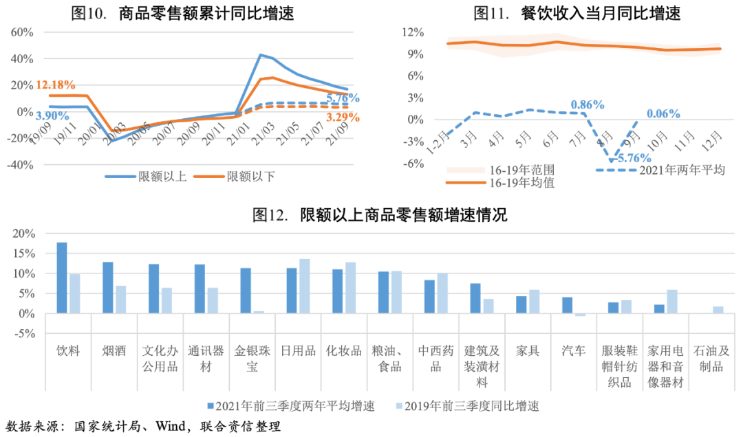 限額以下商品零售和接觸性服務仍是消費的主要拖累,商品零售與疫情前差距主要體現在限額以下的部分,限額以上商品零售額兩年平均增速均為正值,汽車銷售自二季度以來受芯片供應短缺以及排放標準升級切換期等影響,兩年平均增速持續放緩,9月當月汽車零售額兩年平均增速再次落入負值區間。三季度餐飲收入波動較大,8月受疫情沖擊大幅回落,9月回升至正值,接觸性消費由于對疫情變化更為敏感,整體波動較大且較疫情前水平差距較大。