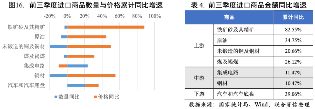 三季度以來,進口增速呈現逐步下行的趨勢,部分大宗商品量減價揚,國際大宗商品價格的上漲抑制了部分國內需求。從主要進口商品看,前三季度鐵礦砂及其精礦是進口增速的主要支撐項,但從三季度開始,其進口數量也逐步下行,或與國內房地產投資走弱相關。四季度,各地“雙限”政策的實施疊加冬季環保政策,或將導致國內工業生產放緩,導致對海外原料的需求下降,預計進口將出現金額和數量雙降。