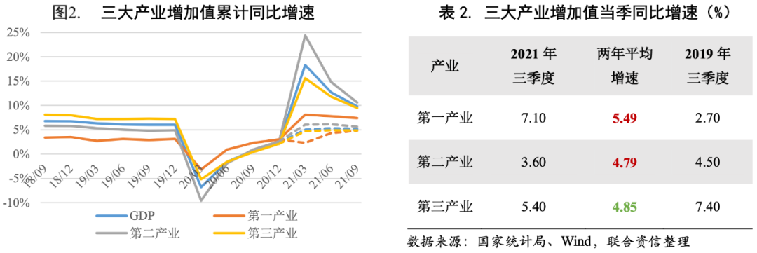 從三大產業來看,三季度第一、二產業增加值兩年平均增速[2]均高于疫情前2019年同期的水平,恢復情況良好;而第三產業增加值兩年平均增速仍未回到疫情前水平,主要是服務業受局部疫情反復影響較大。