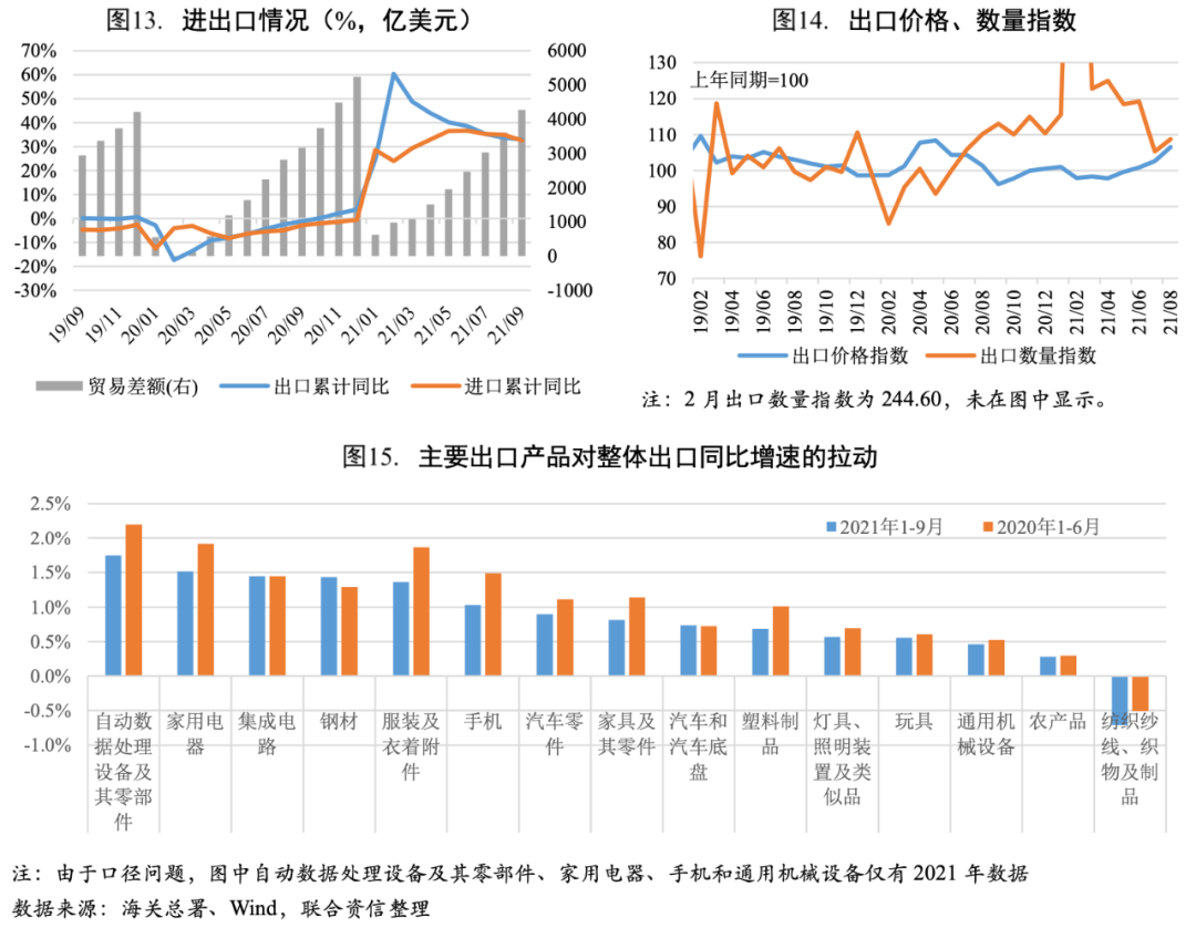 三季度出口增速有所放緩,主要是由于上年基數抬高。全球經濟和貿易回暖帶來的需求增加是支撐我國出口的主要因素,但三季度以來出口價格上漲對出口金額的貢獻度上升,集成電路、手機和家用電器等受大宗商品漲價明顯的行業,出口均表現出量減價增的特點。從三季度主要出口產品對整體出口同比增速的拉動來看,自動數據處理設備及其零部件、家用電器和集成電路依然是出口的最大拉動項;紡織紗線、織物及制品對出口的負向拉動進一步增大。四季度,海外需求修復疊加出口價格上漲或將支撐出口依然保持在較高的水平,但在上年基數抬高的因素影響下,四季度整體出口增速將小幅下行。