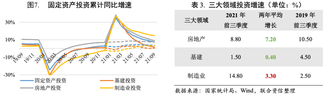 三季度固定資產投資有所放緩。2021年前三季度,全國固定資產投資(不含農戶)39.78萬億元,同比增長7.30%;兩年平均增長3.80%,比上半年兩年平均增長放緩0.60個百分點,三季度固定投資增長有所放緩,前三季度固定投資三大領域中僅制造業投資兩年平均增長回到疫情前水平。
