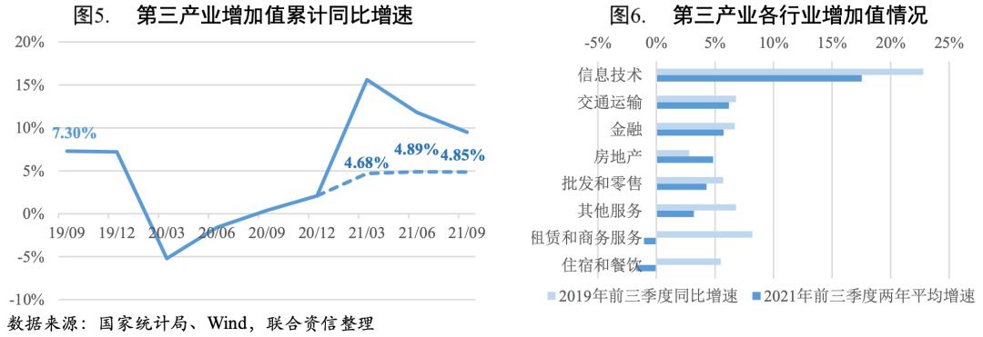 三季度服務業生產小幅回落。三季度第三產業增加值當季同比增長5.40%,兩年平均增長4.85%,較二季度(5.05%)有所回落。前三季度第三產業增加值累計同比增長9.50%,兩年平均增長4.85%,與上半年兩年平均增速略有下降,服務業仍有較大的向上修復空間。9月服務業生產出現積極變化,或是疫情影響減弱以及中秋節小長假帶動服務業向好。第三產業主要行業[4]中僅房地產行業增加值兩年平均增速恢復至疫情前水平,住宿和餐飲、租賃和商務服務業拖累明顯,兩年平均增速仍處于負值區間。