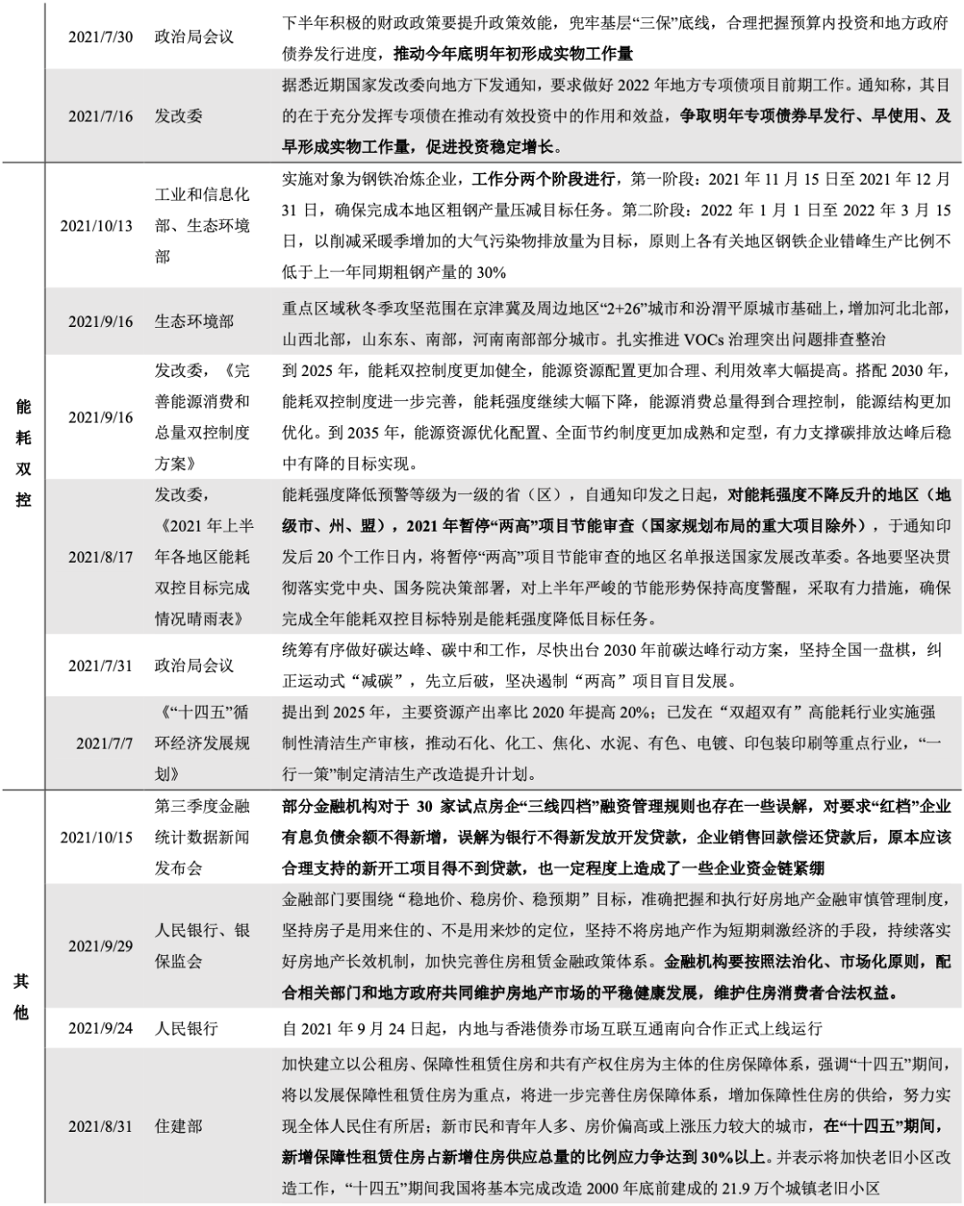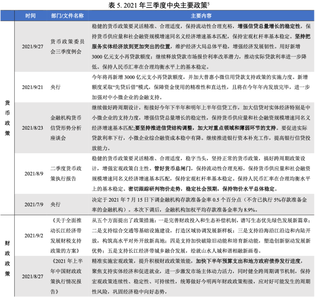 2021年三季度,貨幣政策方面,年內首次下調金融機構存款準備金率0.5個百分點釋放長期資金約1萬億元,新增3000億元支小再貸款額度加大支持小微企業力度,整體來看三季度信貸總量增長穩定,同時突出信貸結構調整;財政政策方面,地方政府債的發行進度有所加快,財政支出呈增長趨勢。“碳中和”要求與“能耗雙控”行動下,限電限產政策在三季度有所加碼。