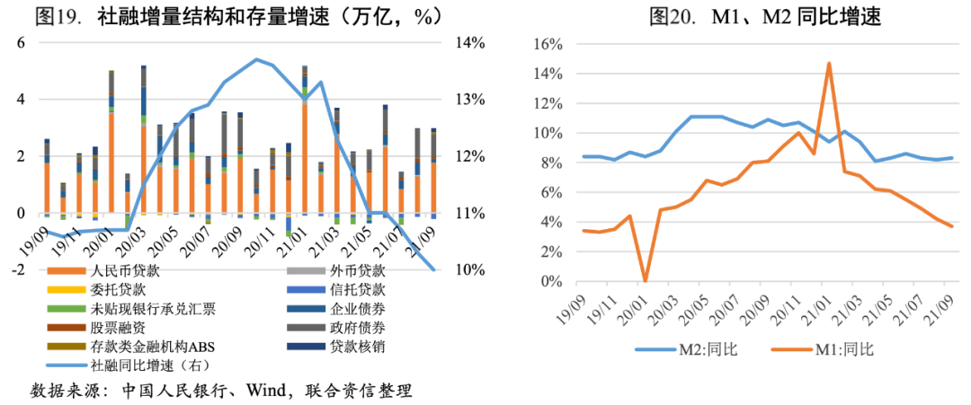 2021年三季度,社融增速延續上半年的回落趨勢,貨幣供應量和社會融資規模的增速同名義經濟增速基本匹配。截至9月末,M2的余額是234.28萬億元,同比增長8.3%,比上半年低0.3個百分點,社融存量余額為308.05萬億元,同比增長10%,比上半年低1個百分點。從結構看,三季度,人民幣貸款是新增社融的主要支撐項;政府債券和企業債券融資同比大幅下降,與2019年同期基本持平,政府債券和企業債券的融資回歸常態;表外融資大幅減少,是拖累新增社融規模的主要因素。