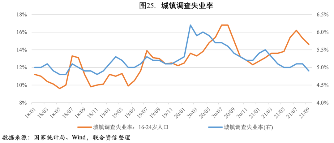 2021年以來就業形勢總體基本穩定,調查失業率呈逐季穩中有降的趨勢。前三季度,城鎮新增就業1045萬人,完成全年目標任務的95%;城鎮調查失業率均值為5.2%,低于全年5.5%左右的預期目標。從結構看,重點群體就業情況在三季度出現改善,其中16-24歲城鎮人口失業率結束自2021年1月以來的連續上升,自8月開始出現下降;截至三季末,農村外出務工勞動力總量同比增長2%,基本恢復至疫情前2019年同期水平。就業形勢基本穩定的同時,依然存在新增就業人數完成進度慢于往年同期的總量壓力,以及部分群體失業率依然較高和沿海一些地區缺工的結構性矛盾,四季度保持就業穩定的壓力依然存在。