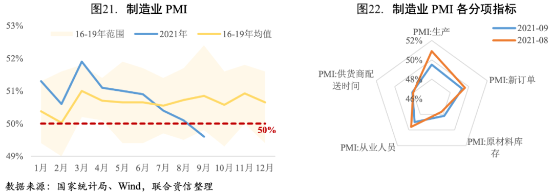 2021年三季度制造業PMI呈現逐月小幅下降的趨勢,9月制造業PMI跌至49.6%,產需兩端均降至榮枯線下,制造業生產活動和市場需求總體放緩。從行業角度看,在調查的21個行業中,有12個高于臨界點,比上月增加2個,但石油煤炭及其他燃料加工、化學纖維及橡膠塑料制品、黑色金屬冶煉及壓延加工等高耗能行業生產和新訂單兩個指數均進一步下滑至45.0%以下,反映了9月制造業PMI降至榮枯線下更多的是受高能耗行業影響。
