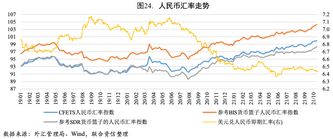2021年以來,美元兌人民幣匯率雙向寬幅波動,三季度以來波動區間收窄;人民幣三大匯率指數延續2020年下半年以來的升值趨勢,主要是由于我國經濟相對較好且國內疫情顯著好于海外,支撐人民幣匯率指數堅挺。四季度,預計人民幣三大匯率指數或將小幅貶值,主要是由于四季度我國經濟恢復的挑戰增多,與海外經濟體的經濟優勢收窄,且各經濟體生產受疫情影響的敏感性下降;Taper臨近疊加美國經濟在疫苗接種和強有力政策支持下繼續改善,人民幣兌美元匯率將面臨一定的貶值壓力,但中美關系緩和利好人民幣,所以整體貶值壓力可控。