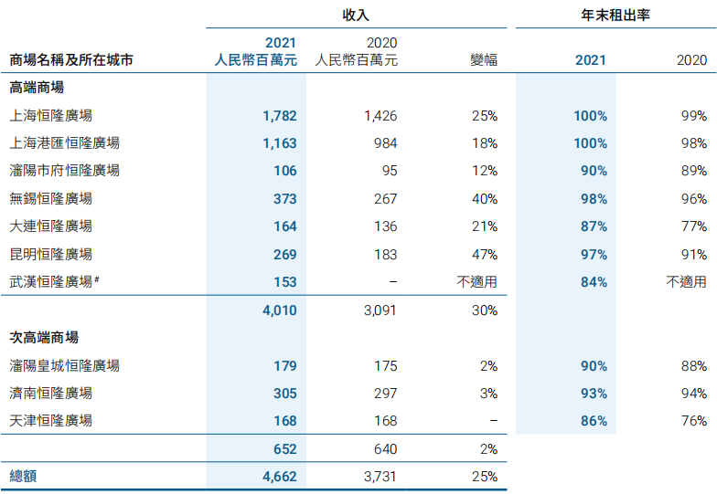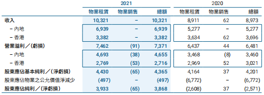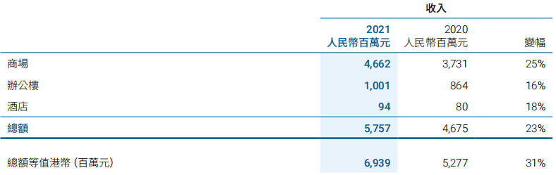 2021年集團(tuán)中國內(nèi)地投資物業(yè)組合的租金收入總額增加24%至港幣35.61億元,主要反映零售銷售額上升及人民幣升值。