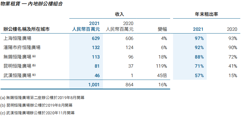 辦公樓組合方面,占內(nèi)地物業(yè)租賃收入總額的17%。2019和2020年開業(yè)的三座新辦公樓租出率持續(xù)上升,令辦公樓的總收入錄得16%的升幅。