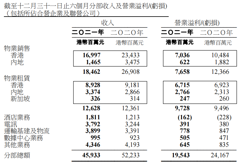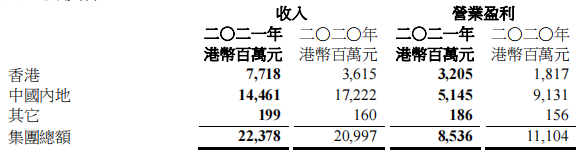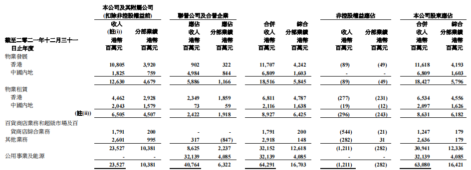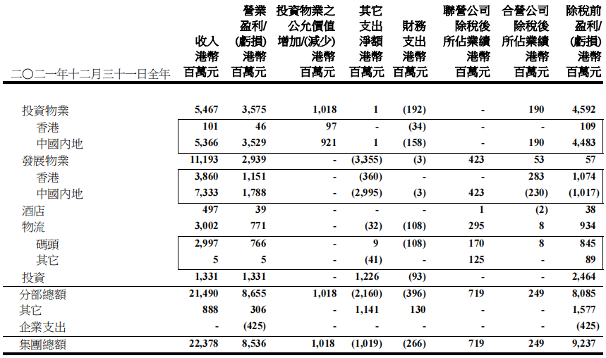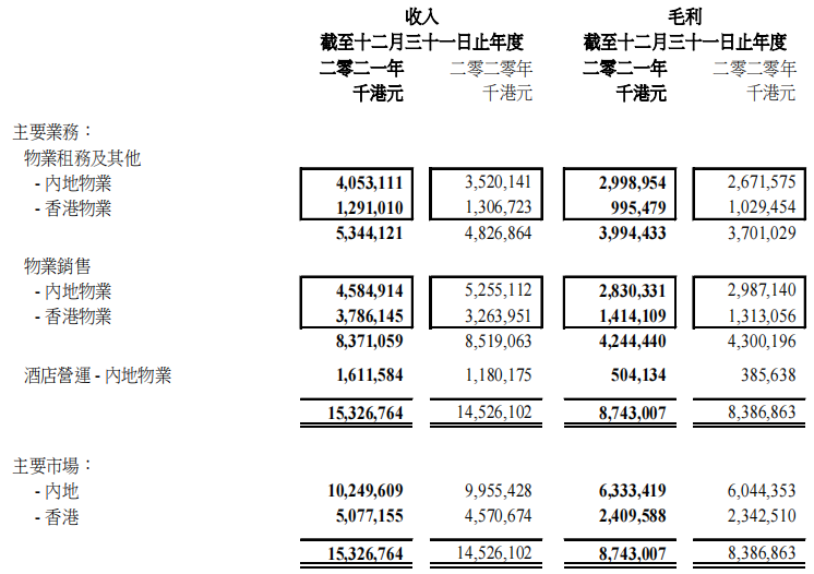 集團(tuán)內(nèi)地已落成綜合用途投資物業(yè)資產(chǎn)組合包括辦公室、零售、出租公寓和酒店,產(chǎn)生收入同比增長21%至56.6 億港元,毛利同比增長14%至35億港元。
