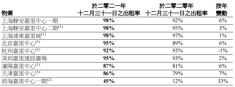 租金及相關(guān)收入同比增幅10%。截至2021年底的出租率為97%。