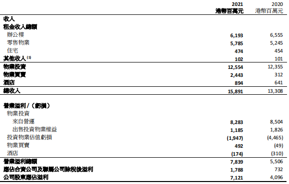 2021年全年,恒隆地產(chǎn)有限公司及其附屬公司的總收入和營業(yè)溢利分別上升15%至港幣103.21億元和上升14%至港幣73.71億元。年內(nèi)并無物業(yè)銷售收入入賬。