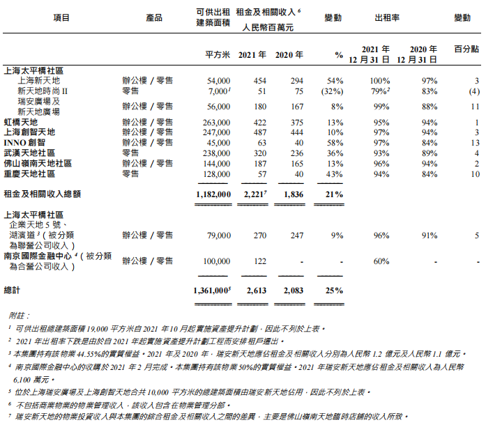 租金及相關(guān)收入增加22%。主要是由于銷售額及客流量增加,以及上海新天地的一部分在完成資產(chǎn)提升計劃并于2020年11月16日試業(yè)后的全年貢獻(xiàn)。