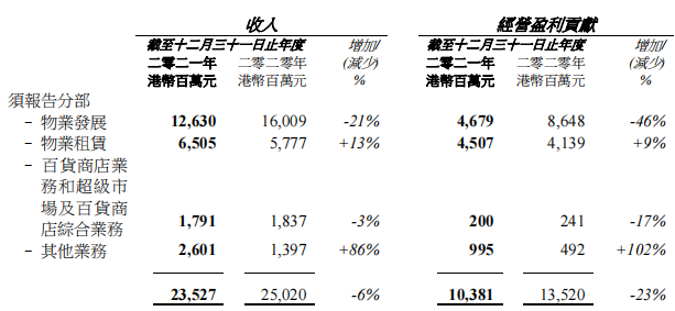 銷售物業(yè)收入為126.30億港元,租金收入為65.05億港元,百貨商店業(yè)務(wù)和超級市場及百貨商店綜合業(yè)務(wù)收入為17.91億港元,其他業(yè)務(wù)收入為26.01億港元。