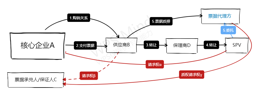 為什么“先票后保”會成為一種創新的融資模式呢?因為對于資金方(簡單模式指保理商,資產證券化模式指投資人)來講,它的信用主體從原來的應收賬款債務人增加甚至部分轉移至了票據債務人。通常情況下,票據承兌人/保證人C為信用等級更優的主體,例如核心企業A的集團母公司或關聯方,因為權利順位的存在,票據請求權β往往是優先被實現的,這無疑減少了信用風險,在資產證券化過程中增加了產品安全性。