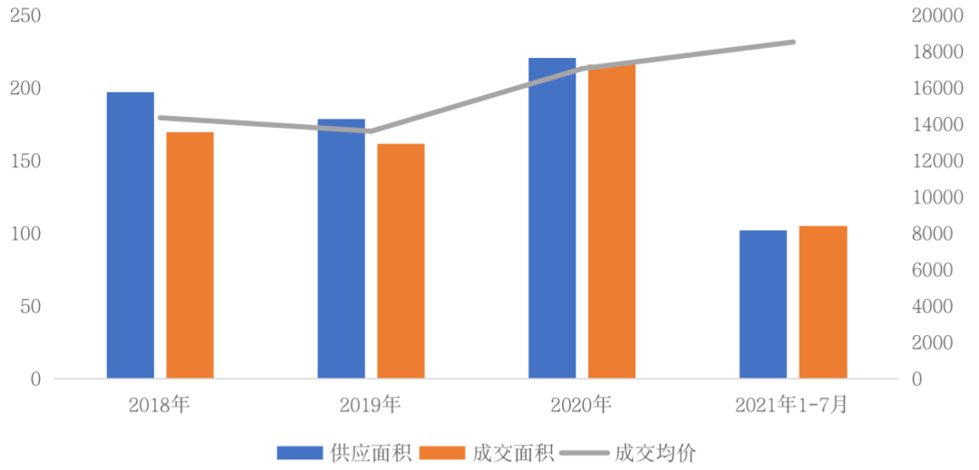 圖:2018年-2021年前7月金華主城區(qū)商品住宅供求量價(單位:萬平方米、元/平方米)