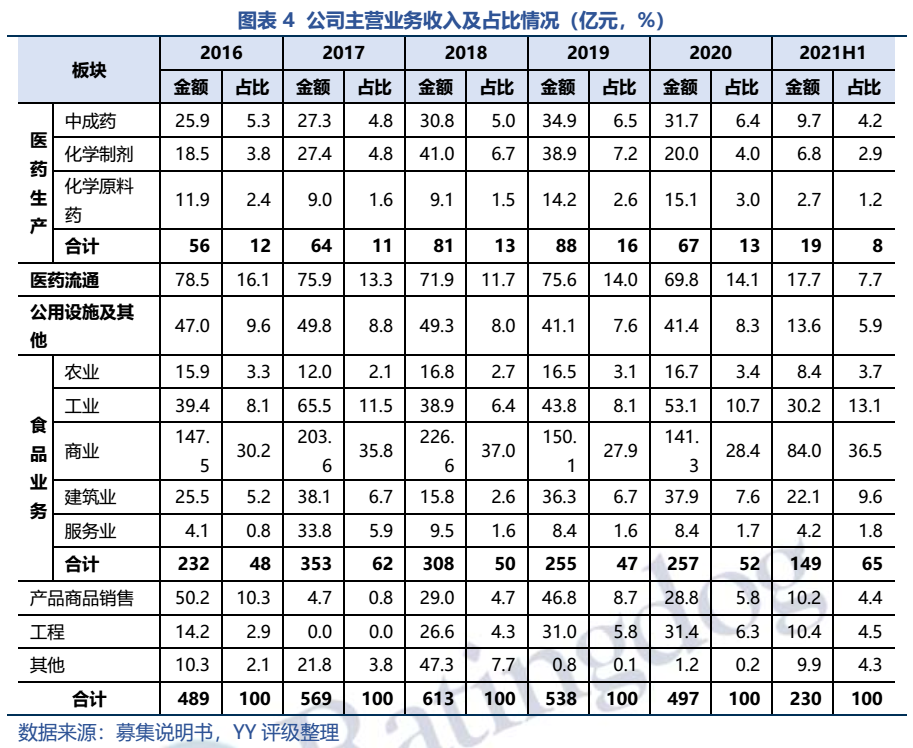 公司主營業務包括醫藥生產及醫藥流通板塊(已出表)、食品業務板塊、公共設施及其他等,核心子公司包括天津醫藥、天津食品、津聯集團等。近年來收入規模持續收縮,目前子公司中,天津醫藥和中環集團已完成混改,天津醫藥出表,對公司主營業務合并層面影響較大,未來可比性弱。