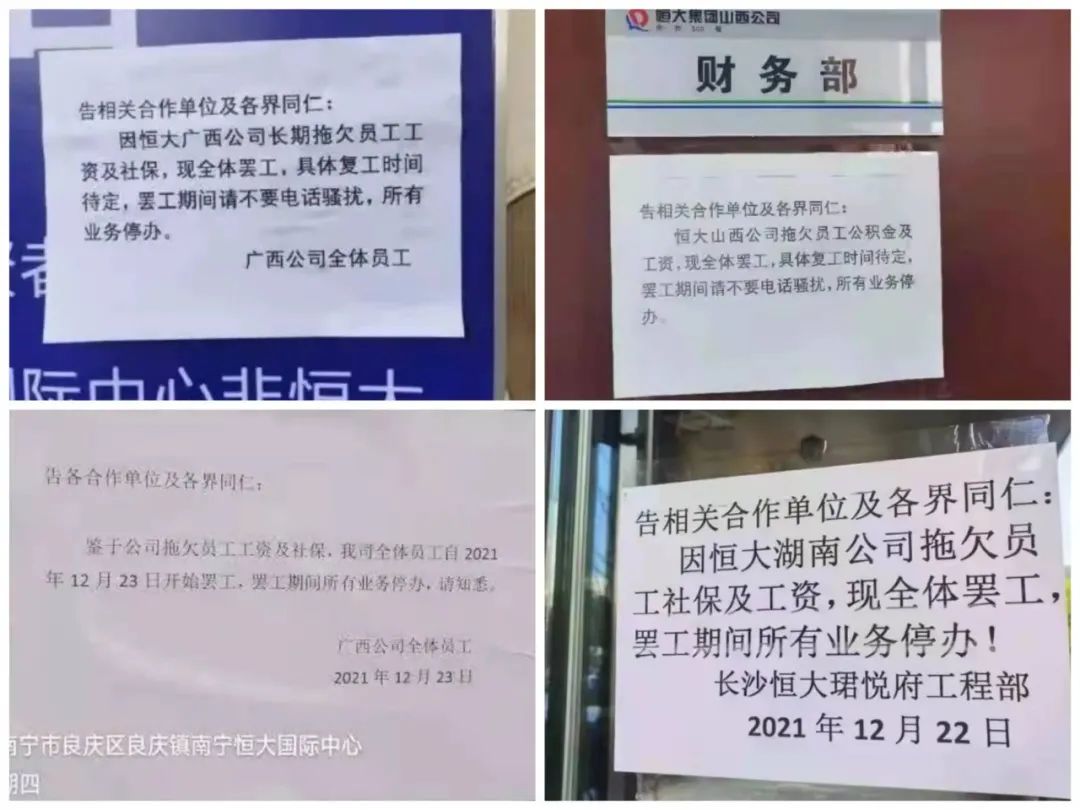 但是好兆頭并沒有能夠溢到城市的項目上。同一天,長沙恒大珺悅府工程部、恒大廣西公司、恒大山西公司相繼發布通知稱,因所在公司拖欠員工公積金及工資,現全體罷工,罷工期間所有業務停辦,具體復工時間待定。