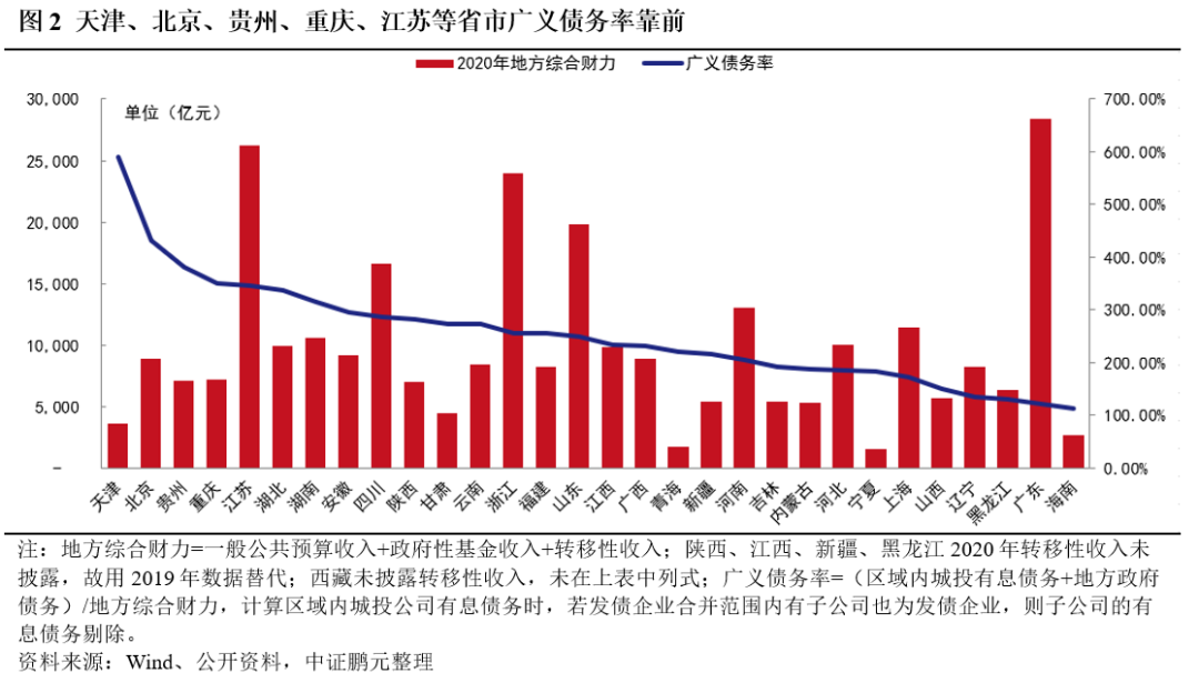 各省市城投債凈融資規模方面,絕大部分省市2021年1-7月的城投債凈融資規模較2020年同期有所下降,江西、浙江、廣東城投債凈融資規模增速靠前,達47%以上,湖北、湖南、江蘇城投債凈融資規模仍保持較快增速。而遼寧、天津、云南、北京、河北、貴州、河南、山西、陜西、重慶、廣西等省市城投債凈融資規模大幅下降,其中天津、云南、北京凈融資規模由正轉負,且2021年1-7月凈融資規模降幅較2020年繼續大幅下降,貴州、陜西、重慶2021年1-7月城投債凈融資規模增速較2020年大幅下降,遼寧、黑龍江2020年及2021年1-7月的凈融資額持續為負。在監管趨嚴的背景下,各省市之間城投債發行及凈融資規模分化進一步加劇,資金向浙江、江蘇、廣東經濟發展水平高及江西、湖北、安徽中部省份聚集,而債務水平較高、出現風險事件、經濟發展水平靠后的省市城投債發行及凈融資規模有所下降。