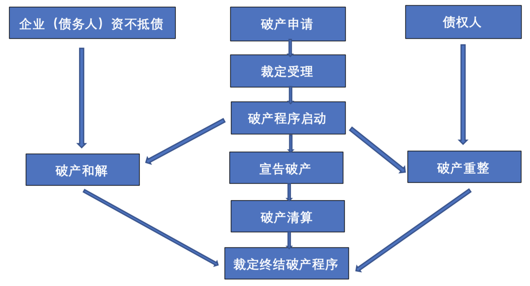 廣義上的企業破產程序包括清算、重整與和解程序。當企業不能清償到期債務,資產不足以清償全部債務或喪失清償能力時,則企業可以根據不同情況進入不同的破產程序,其法律流程如下圖所示: