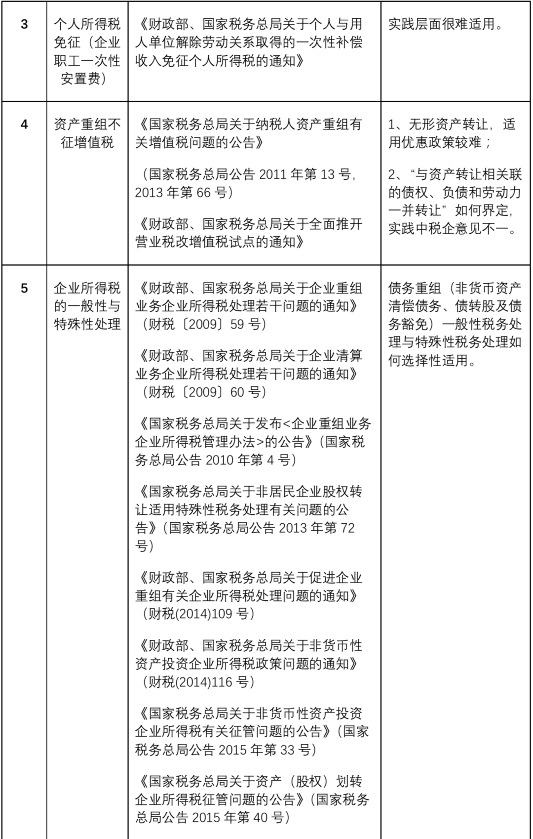 我國目前沒有專門針對破產企業適用的稅收優惠政策,這也增大了在破產程序中對稅負成本預測的難度。筆者對目前我國破產程序中涉及的稅收優惠政策整理如下(表二):