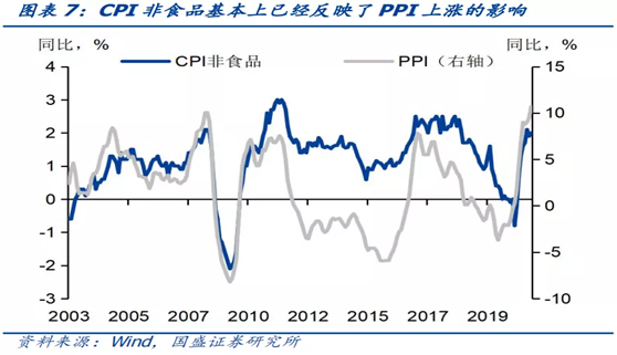 實際上,PPI向CPI的傳導(dǎo)早已就開始。據(jù)國盛證券表示,以非食品CPI走勢已反映了工業(yè)品價格上升影響,與PPI走勢高度同步。