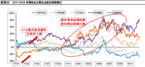 統(tǒng)計上述主要調(diào)味品16—18年間股價變動,在提價公布后短期內(nèi)股價均處于上漲狀態(tài)。