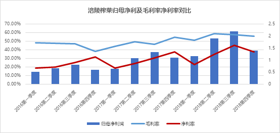 涪陵榨菜的提價對毛利率和凈利率貢獻是巨大的。主要也體現(xiàn)在四季度上,毛利率同比增長16.43%,首次突破50%,達54.34%,創(chuàng)出階段歷史新高。