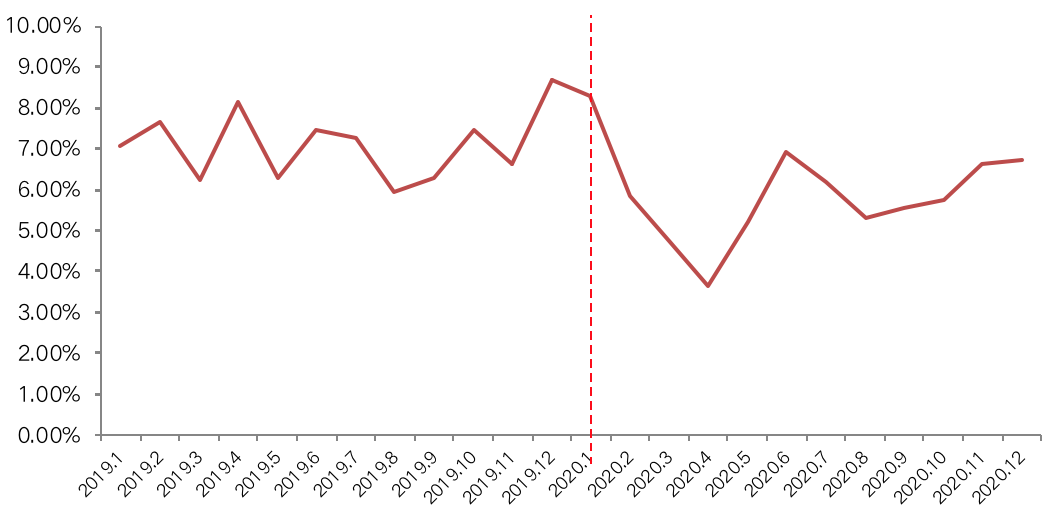 從融資成本來看,2020年房企的新增債券類融資成本為6.13%,同比下降0.91個百分點。從單月的融資成本走勢來看,除了1月外房企的單月加權(quán)平均融資成本均小于7%,其中以4月份最低,6月份最高,主要在于4月房企無境外債發(fā)行導(dǎo)致的成本較低,而6月則有部分成本較高的房企進(jìn)行數(shù)額較大境外債的借新還舊,導(dǎo)致成本相對較高。