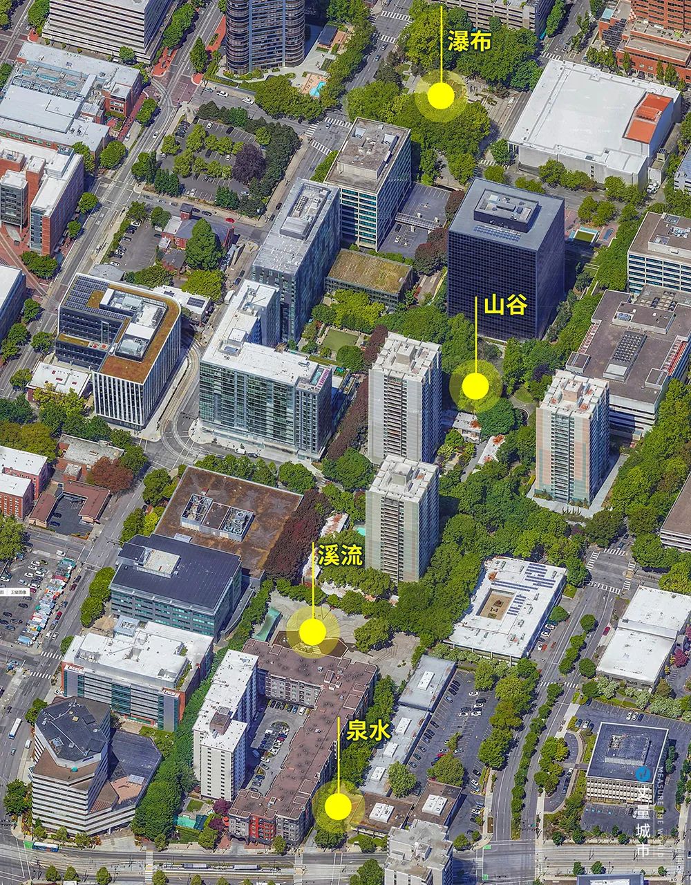 從山澗的涌泉流出,注入愛悅廣場形成溪流,在帕蒂格羅夫公園短暫積蓄力量后,最后在演講堂前廣庭場變成氣勢磅礴的瀑布,這是一個連貫的自然形態演變。