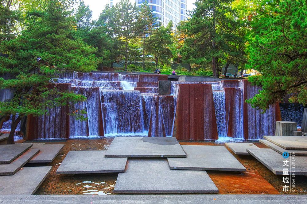 珍珠區繁華地帶的唐納泉水公園,可謂是螺螄殼里做道場,在60m見方的地方,塑造了一個「復雜」的城市公園。收集雨水匯入由噴泉和自然凈化系統組成的天然水景,回收鐵軌舊材料重新利用并建造公園中的「藝術墻」。