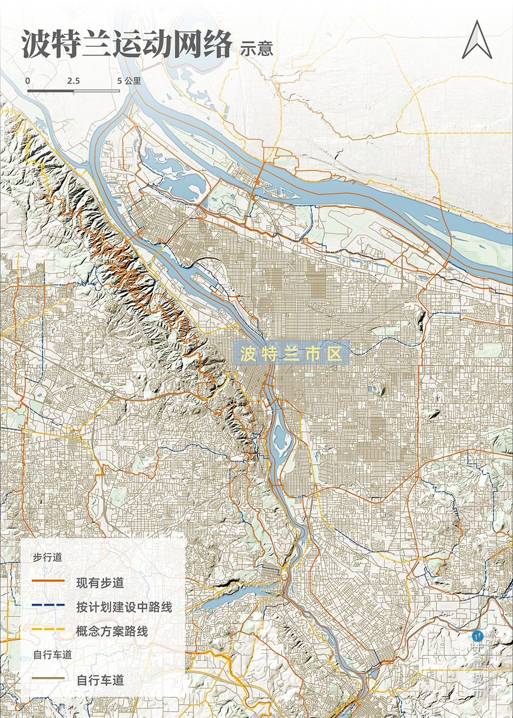 比如,在宏觀層面,雖然「城市發展邊界」限制了其向市中心以西圖拉丁山脈延伸發展,但是卻催生出了著名的波特蘭森林公園、華盛頓公園及其縱橫穿插其中的步道,不僅彰顯生態優勢,而且為市民創造了豐富的休閑場所,甚至為城市旅游乃至文化品牌建設貢獻了巨大的價值。