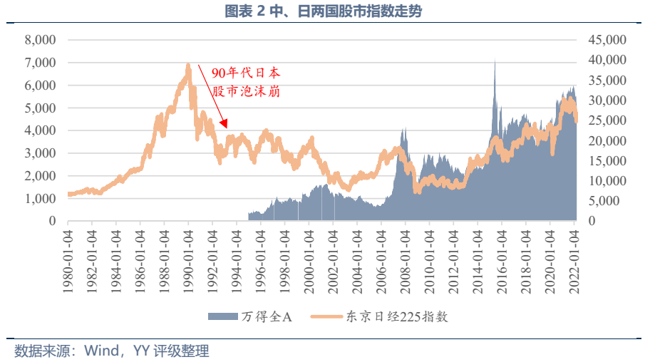 股市2022年開(kāi)年以來(lái)在俄烏沖突、大宗商品暴漲等因素下經(jīng)歷暗黑行情,萬(wàn)得全A指數(shù)3月份最低點(diǎn)較12月份最高點(diǎn)(也是2016年以來(lái)最高點(diǎn))跌去約21%。不過(guò)預(yù)計(jì)此輪下跌不足以像日本一樣引發(fā)全社會(huì)的資產(chǎn)負(fù)債表衰退危機(jī),主要原因有以下兩點(diǎn):一是中國(guó)股市存在巨大泡沫的可能性遠(yuǎn)小于日本當(dāng)時(shí)(3月下旬萬(wàn)得全A指數(shù)相較過(guò)去5年最低點(diǎn)僅高出65%,而日本泡沫崩塌的前五年日經(jīng)225指數(shù)漲幅超過(guò)200%);