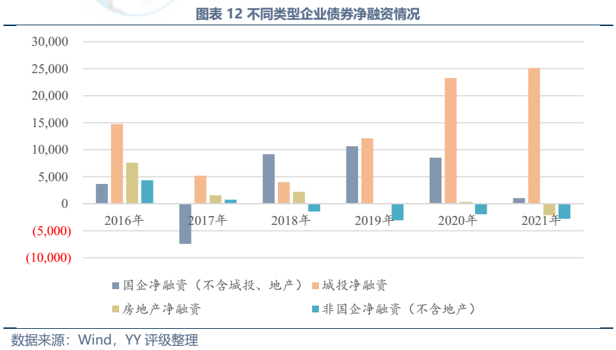 2018年以來(lái),非國(guó)企部門(mén)(不含房地產(chǎn))債券凈融資持續(xù)為負(fù)。一方面民營(yíng)企業(yè)過(guò)去累積違約率確實(shí)顯著高于國(guó)企,YY評(píng)級(jí)9、10的265個(gè)主體中,央企、地方國(guó)企合計(jì)僅54個(gè),因此金融機(jī)構(gòu)對(duì)于民企的認(rèn)可度總體仍較低。另一方面,即使是資質(zhì)較好的民企,近年來(lái)在投融資方面也趨于謹(jǐn)慎,如投資級(jí)非國(guó)企(不含地產(chǎn),YY等級(jí)1~5-)2021年凈融資規(guī)模也達(dá)-236億元,一項(xiàng)原因是近些年錢不如過(guò)去好賺,各行各業(yè)投資風(fēng)險(xiǎn)提升,且民企外部支持弱,再融資受行業(yè)景氣度、企業(yè)經(jīng)營(yíng)業(yè)績(jī)影響很大,穩(wěn)定性弱,杠桿要加上去容易,但投資有回收期,這個(gè)期間再融資能否維持不確定性大;且負(fù)債是剛性的,而資產(chǎn)的風(fēng)險(xiǎn)增加,因此近年來(lái)民企加杠桿意愿減弱。