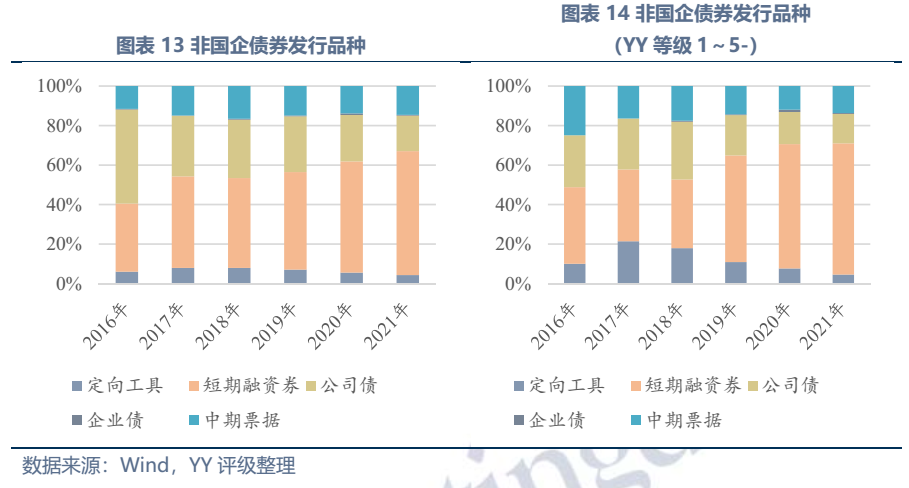 另外,從發(fā)行品種來(lái)看,無(wú)論是全部非國(guó)企還是投資級(jí)非國(guó)企,近年來(lái)發(fā)行短期融資券的比例都逐年提升,2021年短期融資券在全部非國(guó)企、投資級(jí)非國(guó)企新發(fā)債券中的比例分別高達(dá)62.7%、66.4%。尾部民企短期融資券發(fā)行占比提升主要是發(fā)行長(zhǎng)期限品種較難,而對(duì)于信用資質(zhì)較好的民企,其發(fā)行長(zhǎng)期限品種減少或反映民企債權(quán)融資用途愈來(lái)愈集中于籌集日常運(yùn)營(yíng)資金,而進(jìn)行長(zhǎng)回報(bào)期資產(chǎn)投資的意愿下降。
