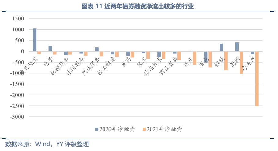 從債券領(lǐng)域來(lái)看,2021年凈流出最多的為房地產(chǎn)行業(yè),凈流出2,513億元,而地產(chǎn)行業(yè)在過(guò)去曾是融資的主力軍,2018年凈融資規(guī)模3,587億元,居各行業(yè)第一。另外,鋼鐵、能源、有色等重資產(chǎn)傳統(tǒng)行業(yè)近年來(lái)受落后產(chǎn)能關(guān)停、新增產(chǎn)能嚴(yán)格受限影響,2021年凈融資流出規(guī)模也較大。