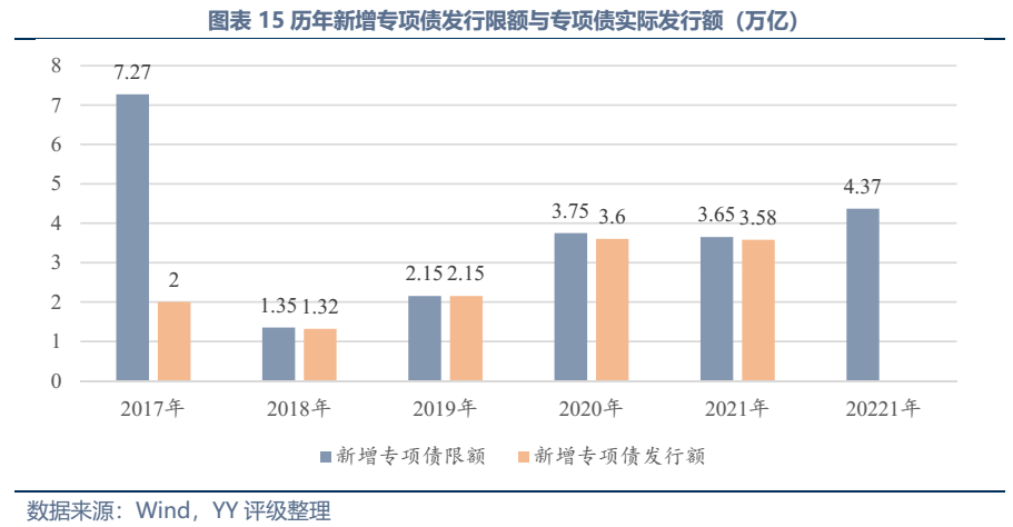 嚴(yán)控地方政府隱性債務(wù)是不可放松的底線,以往的城投,角色定位是突破了財(cái)政硬約束,通過(guò)土地杠桿,實(shí)現(xiàn)土地金融化的資金撬動(dòng)功能,但對(duì)于地方政府在其中的職責(zé)是沒(méi)有厘清的,不同時(shí)期、不同區(qū)域的地方政府理解不同,地方政府、平臺(tái)、投資對(duì)于其權(quán)利義務(wù)的范圍理解也不同,而規(guī)范的債權(quán)債務(wù)關(guān)系應(yīng)當(dāng)是權(quán)利、義務(wù)、各方當(dāng)事人等要素完備、明確且受法律保護(hù)的。明確屬于政府性工程的,應(yīng)當(dāng)嚴(yán)格納入財(cái)政預(yù)算并由政府作為債務(wù)主體。因此當(dāng)前遏制新增隱性債務(wù)相關(guān)政策密集出臺(tái),同時(shí)政府顯性債務(wù)作為替代發(fā)力明顯,2020年、2021年兩年財(cái)政赤字率都超過(guò)3%的紅線,同時(shí)2020年以來(lái)專項(xiàng)債年新增發(fā)行規(guī)模在3.6萬(wàn)億左右,2022年下達(dá)的新增專項(xiàng)債限額達(dá)到3.65億元,較2021年持平(下圖有誤)。