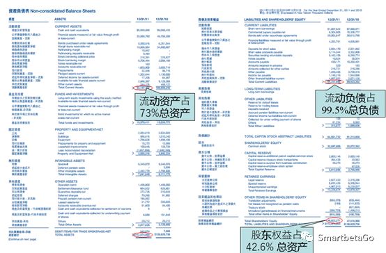 證券業經營范圍主要是證券交易、證券發行、證券中介,收入結構以手續費和資本利得收入為主,杠杠相對較小。其負債端為借款(包括長短期),資產端的資產屬于主動管理的性質,依賴于機構主動管理的能力,資產的流動性較佳但波動性較大。證券業對于資產負債匹配的需求較小。市場風險是證券業主要的風險。從下圖可以看出證券公司的資產負債表表現出以短支短、低杠桿比的特征。