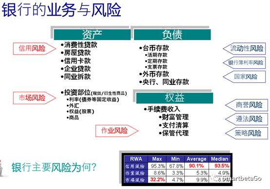 銀行業業務經營的范圍也是以貸款為主,收入結構中利差是主要的貢獻因子,杠桿高于證券行業,大約為12.5倍。其負債端主要為存款,資產端大部分屬于被動式管理,貸款的品質好壞決定其損益,貸款資產本身缺乏流動性。銀行業的資產與負債需要在利率、到期長短等條件上匹配。銀行業主要風險是信用風險及流動性風險。從下圖中可以清晰的看出銀行的業務及其風險。