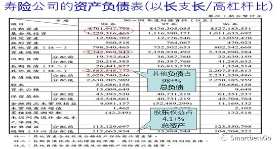 保險業經營范圍以保單銷售為主,收入結構以保險費中的三差(費差、死差、利差)為主,其杠桿非常大。其負債端以保費收入為主,資產端的運用也是相對被動的(做到什么利率的保單就對應什么收益率的投資商品),資產與負債在久期、持倉屬性與現金流量等條件上要匹配。由于保險業資產運用大部分購買固定收益型產品,所以主要風險還是信用風險。從下圖可以看出壽險公司以長支長及高杠桿比的特征。