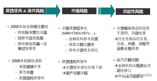 不同的風險之間相互傳導,這一點在2008年金融危機中表現的尤其明顯。2008年金融危機源自于信用風險與操作風險的控管松散,蔓延擴散至市場風險與流動性風險,如下圖所示: