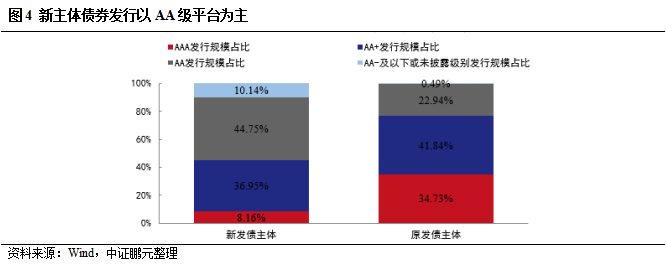 新發債區域基本為市轄區、縣及縣級市,大部分區域一般預算財政實力較弱,新發債區域的新主體級別大部分為AA級,另外有較多為AA-及以下與未披露級別的平臺