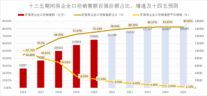 參照十三五期間百強(qiáng)房企銷售額占比,十四五期間百強(qiáng)房企銷售額市場份額仍將繼續(xù)上升,預(yù)計(jì)還有約10%的增長空間;