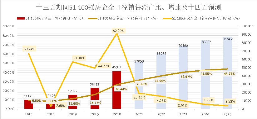 預(yù)計(jì)51-100強(qiáng)房企銷售額會在十四五期間繼續(xù)保持增長,但是隨著大盤子的增速放緩以及50強(qiáng)房企的規(guī)模擠壓,增速會呈現(xiàn)回落,但份額依然有穩(wěn)步做大的空間。