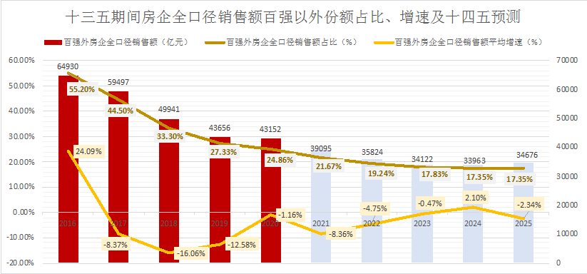 預(yù)估十四五期間百強(qiáng)外房企銷售額增速有望回正。