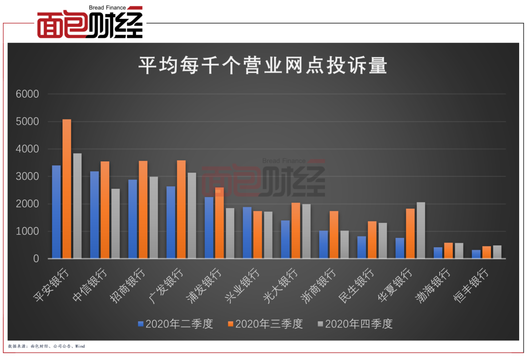 根據銀保監會官網公布的數據測算,2020年第二至第四季度,平安銀行個人貸款業務及平均每千營業網點投訴量居股份制銀行之首。另外,該行信用卡業務及理財業務的投訴量也較高。